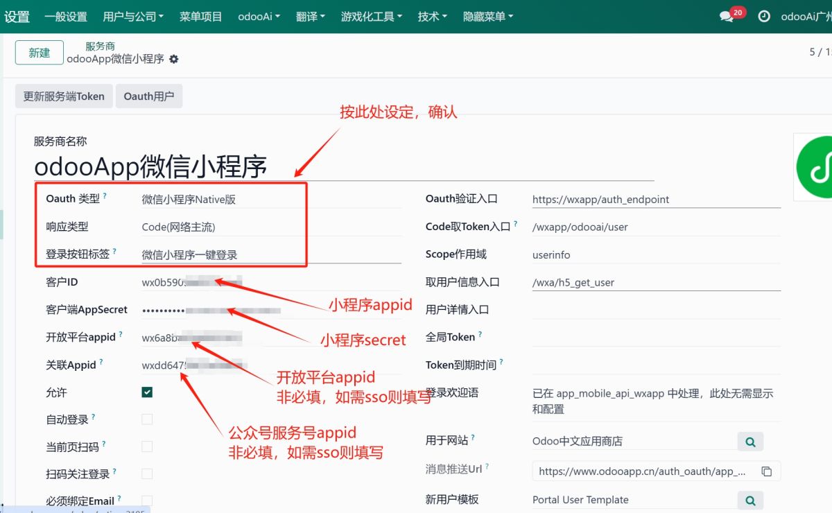 2. Setup Oauth from : Settings-->Users& Companies --> OauthProvider,select and set "微信原生小程序"。 进入 设置-->用户与公司-->Oauth服务商,选择并设置 ”微信原生小程序“