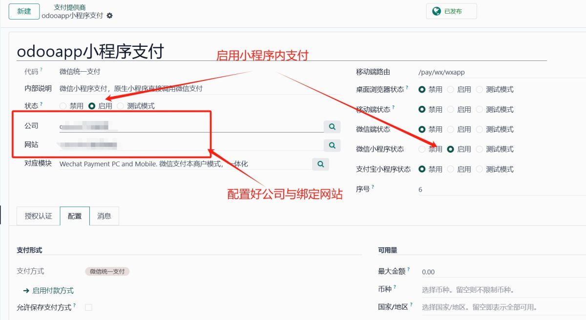 ”微信小程序状态“要启用,参考下图,详情见 app_payment_wechat 模块指导文档