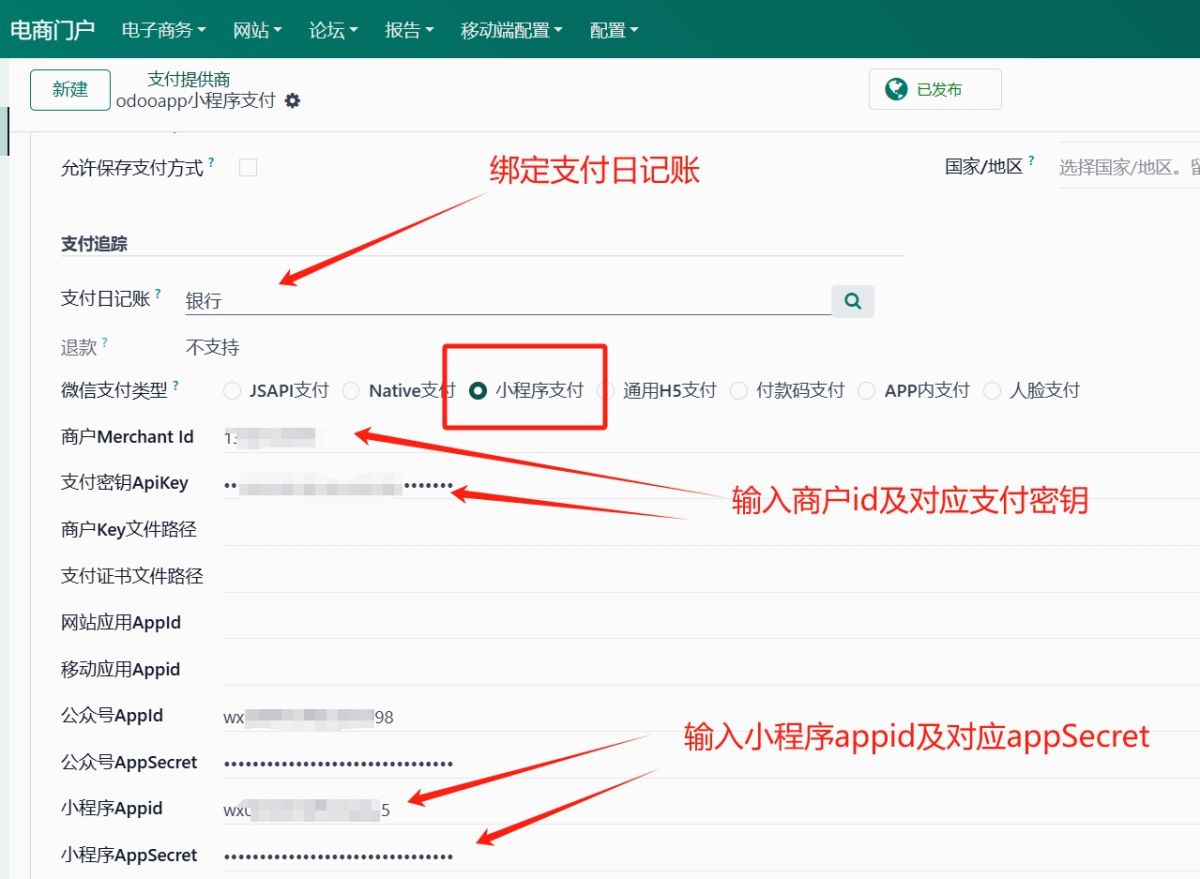 配置好小程序支付信息,未标明的字段可以不设置,详情见 app_payment_wechat 模块指导文档