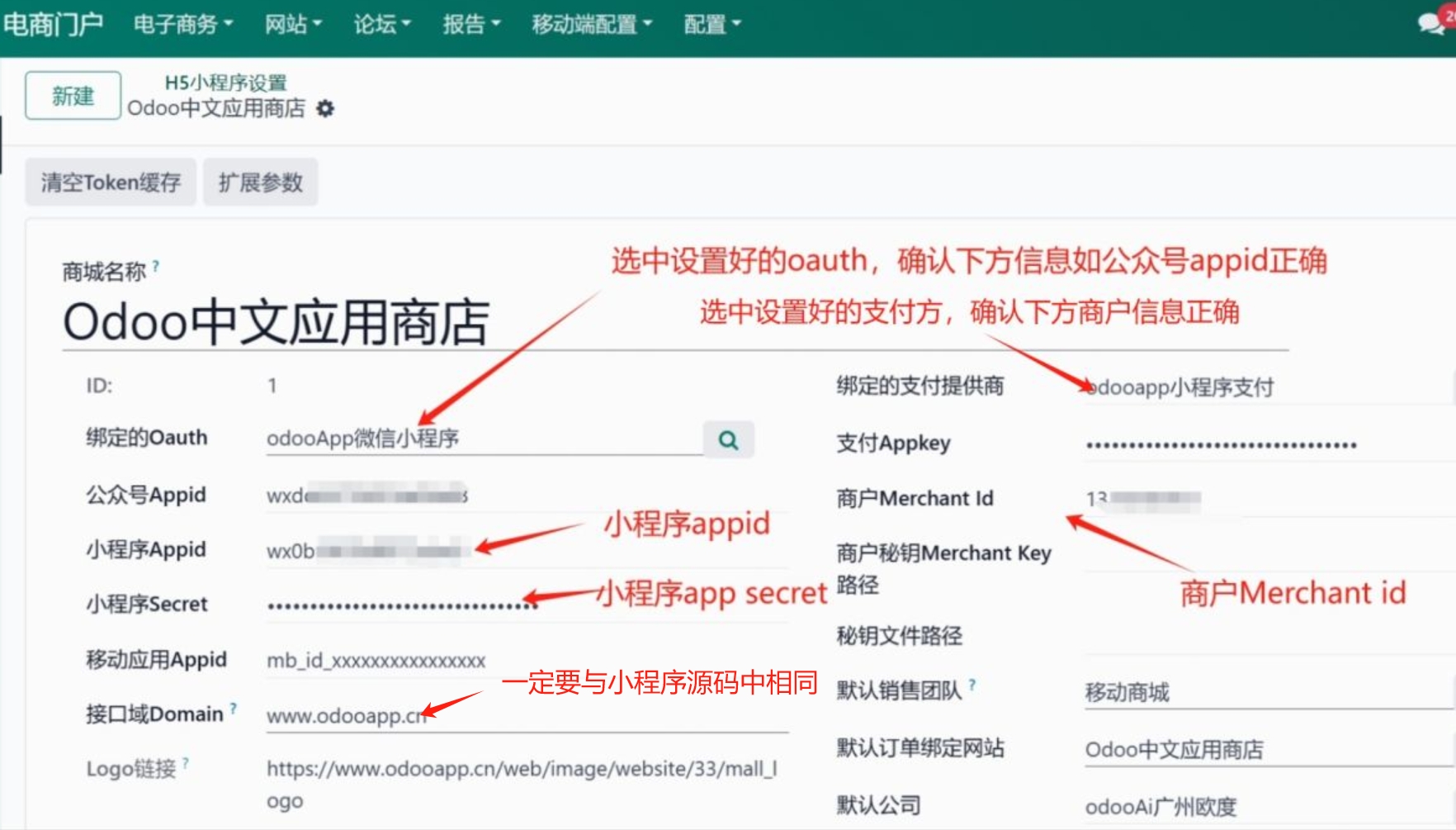 4. Input the extra information from: Website-->Mobile Setting-->Connector。进入配置 网站-->移动端配置-->H5小程序配置