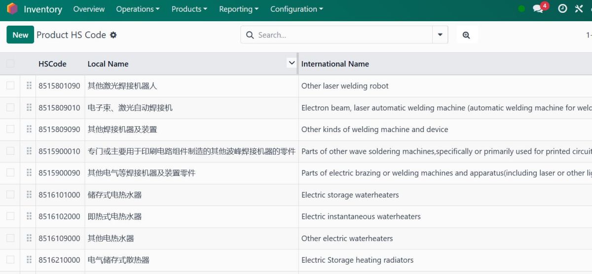 1. Manage International Product Harmonized Code. Including code, Internation name, local name.