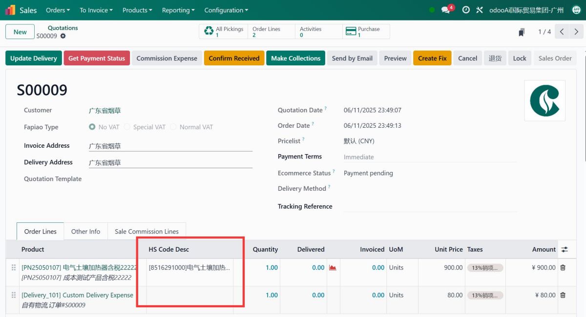 - 3. HS Code in Sale order, sale report. 管理销售订单中的 hscode, 可在销售订单中打印
