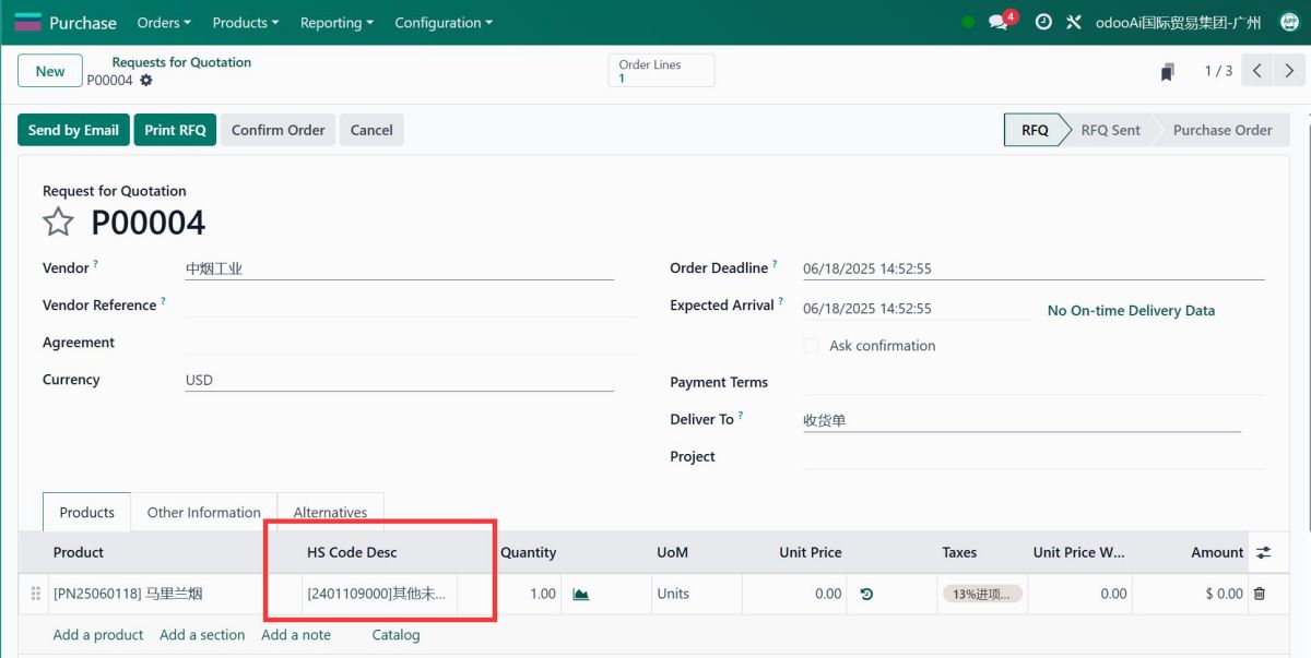 - 4. HS Code in Purchase order, purchase report. 管理采购订单中的 hscode, 可在采购订单中打印