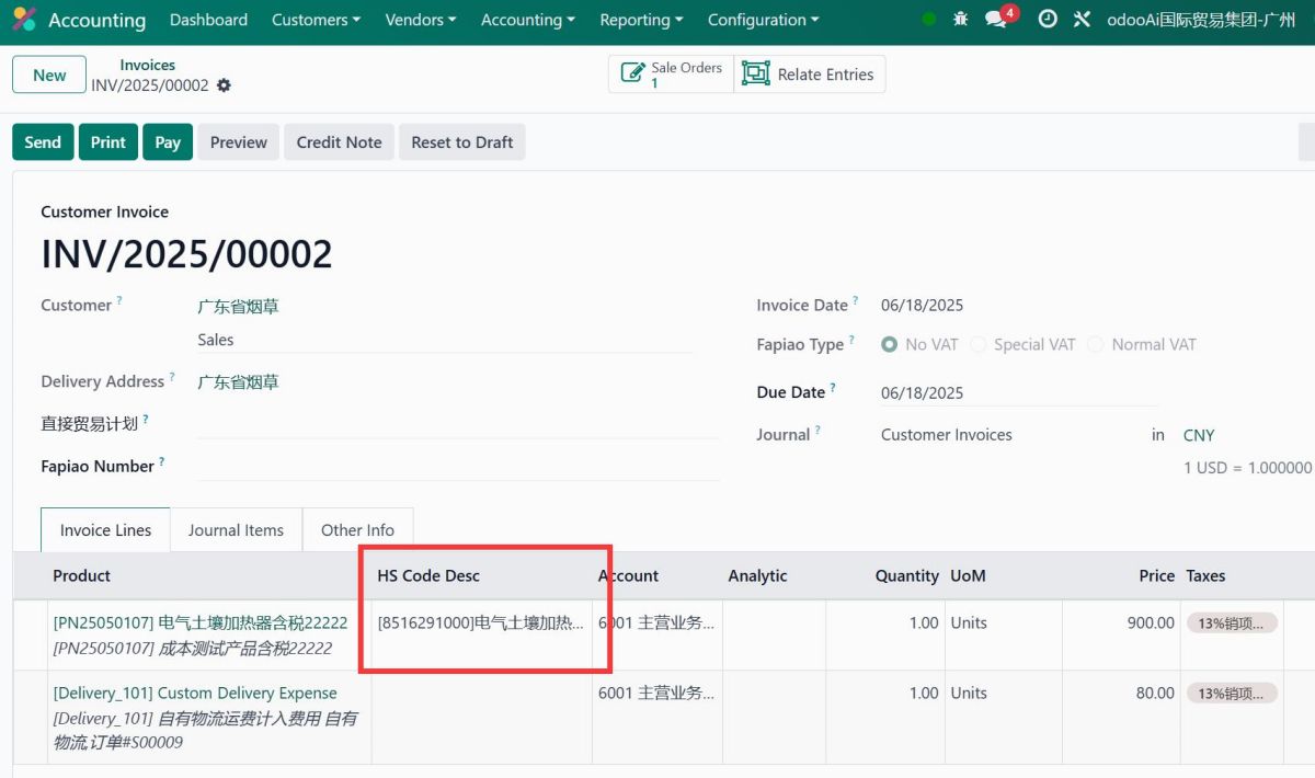 - 5. HS Code in Invoice, invoice report. 管理收据账单中的 hscode, 可在收据账单中打印